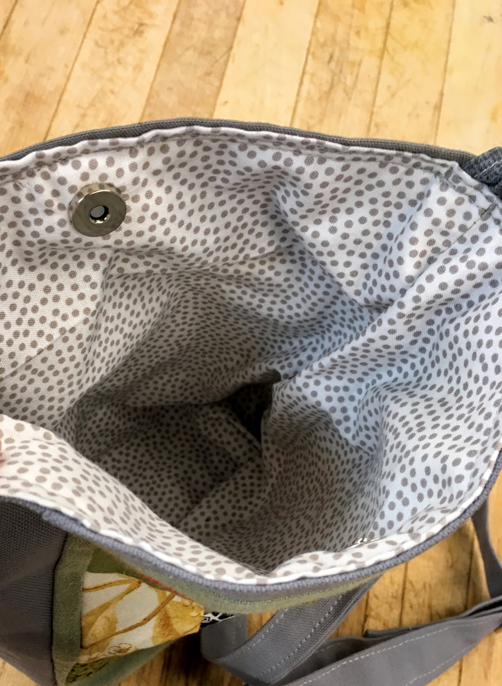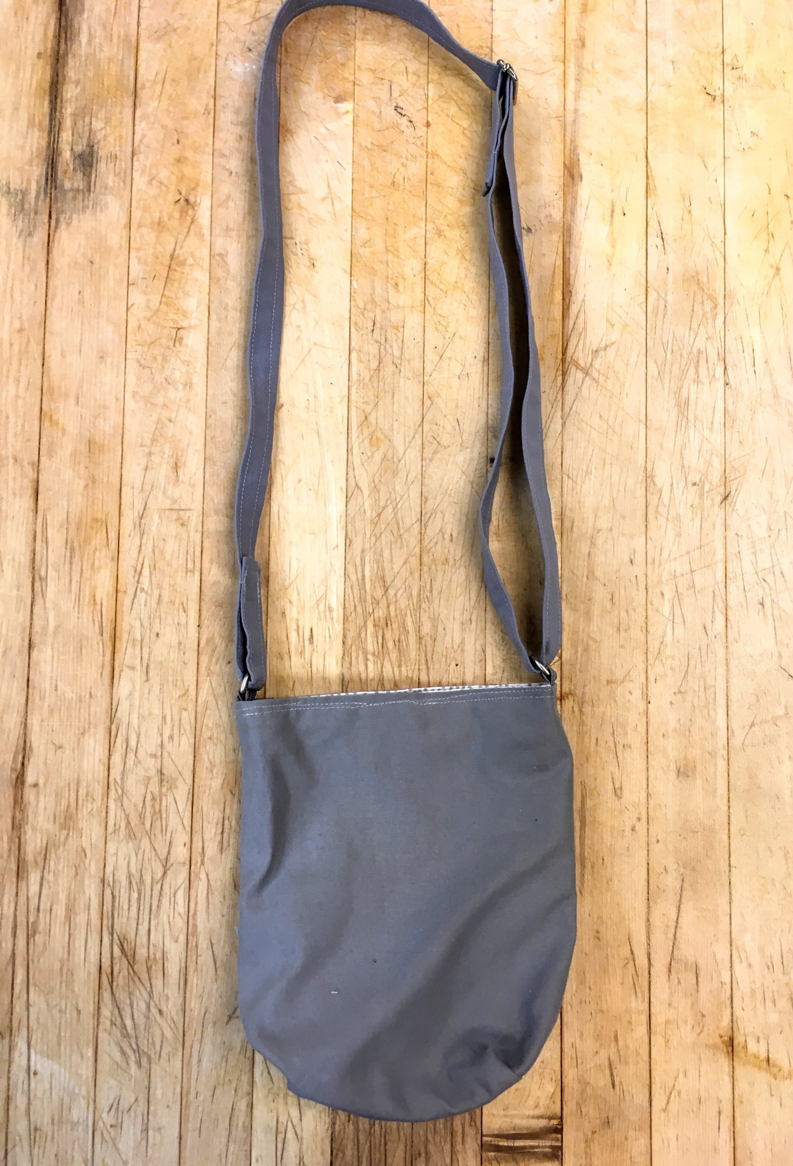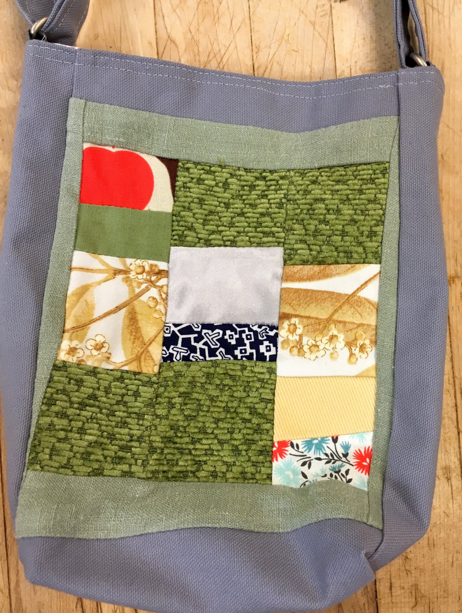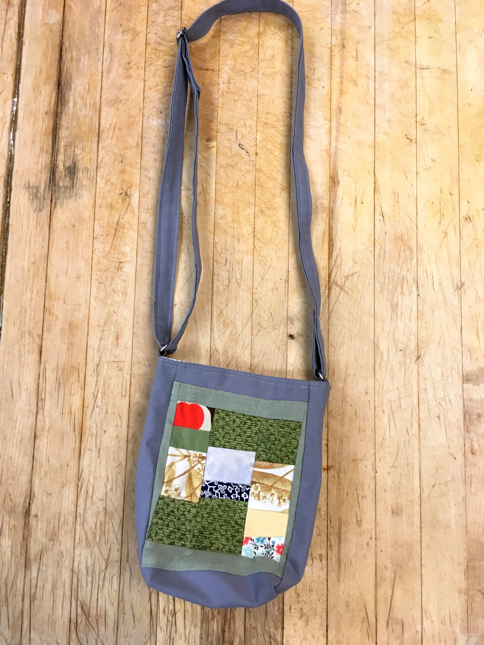 A mini square patchwork cutie! Lined. One adjustable strap; can be worn cross-body if preferred. Magnetic snap.