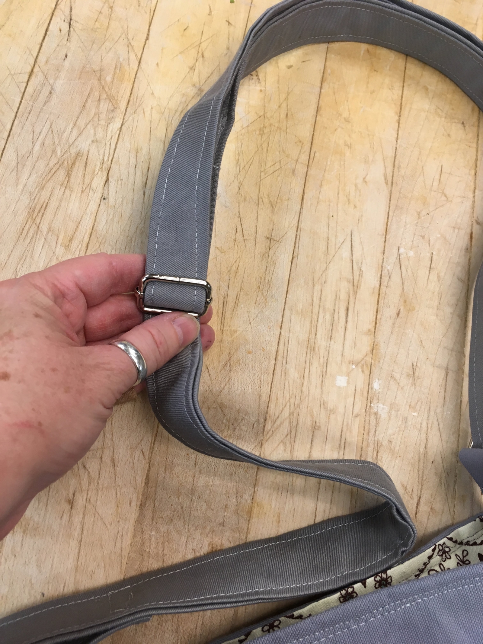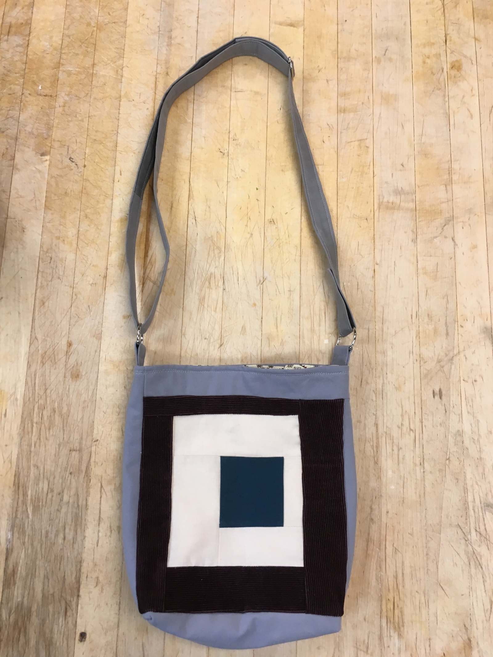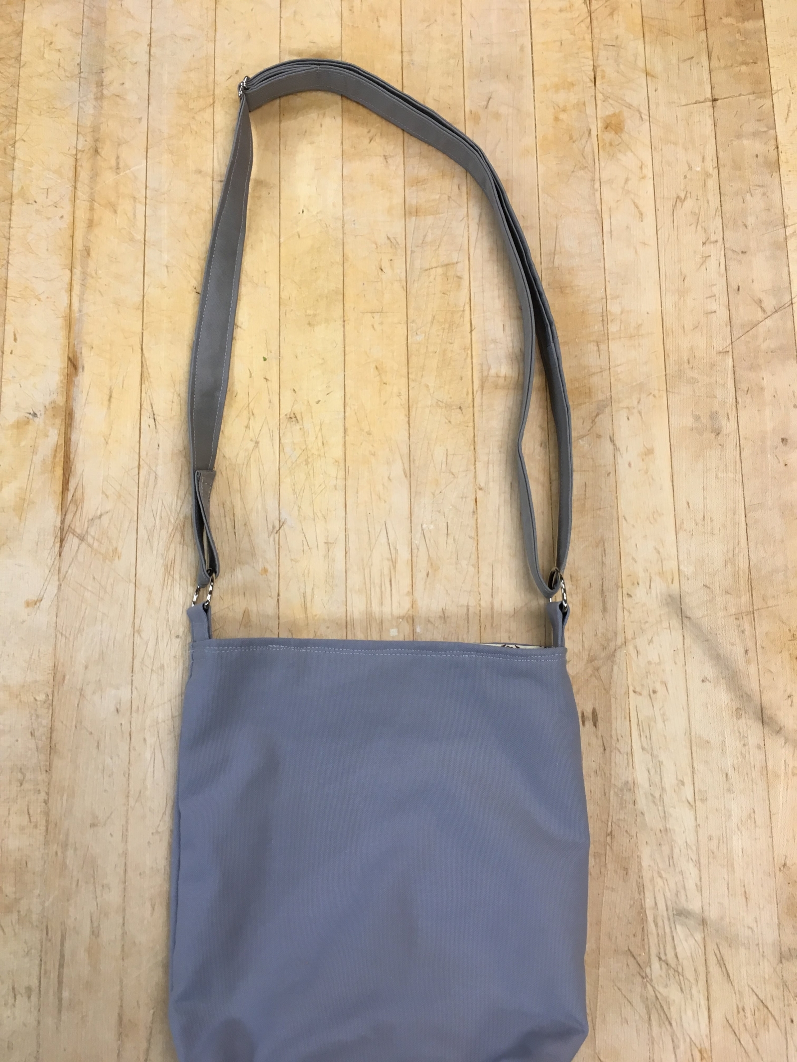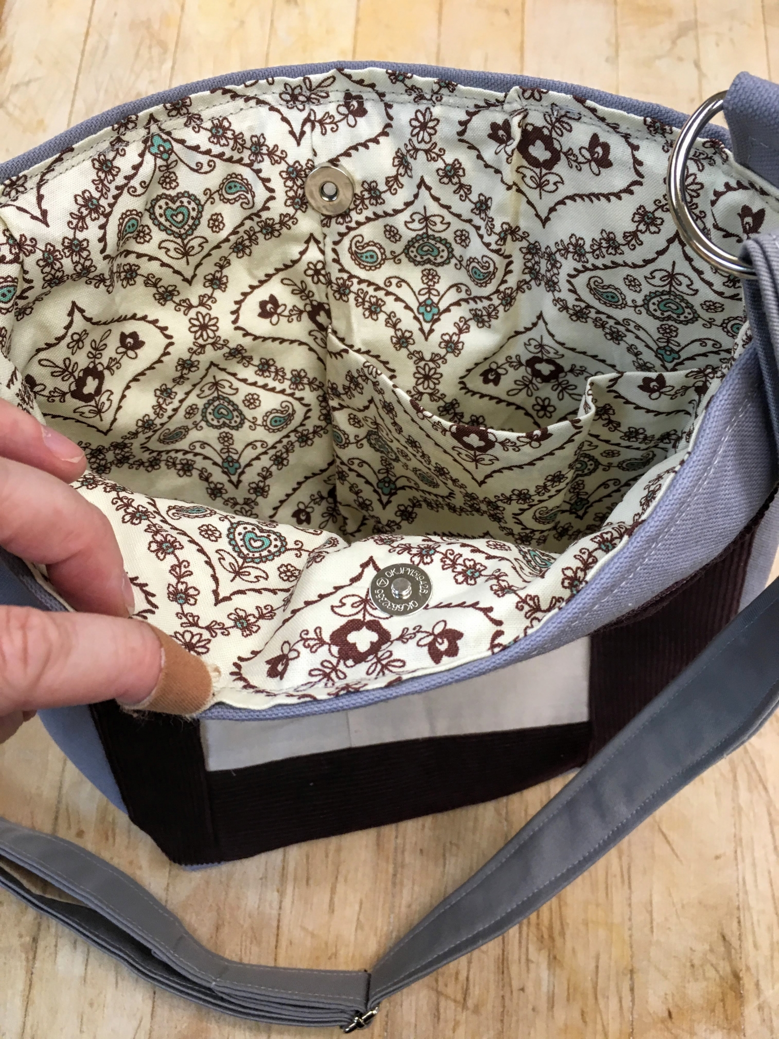 Lined. One adjustable strap; can be worn cross-body if preferred. One inside pocket + magnetic snap.