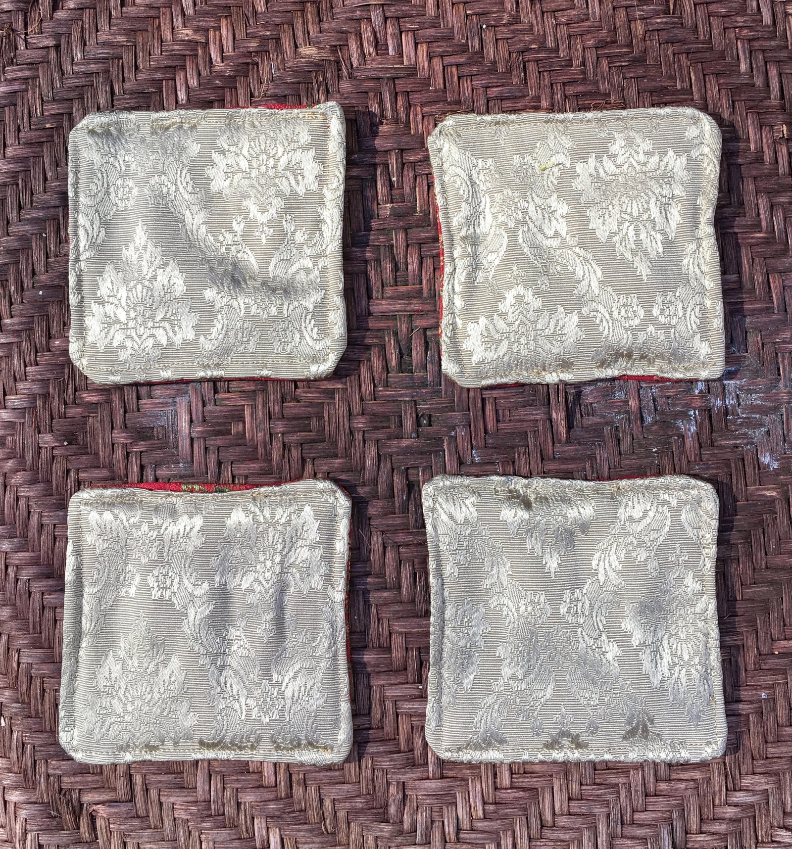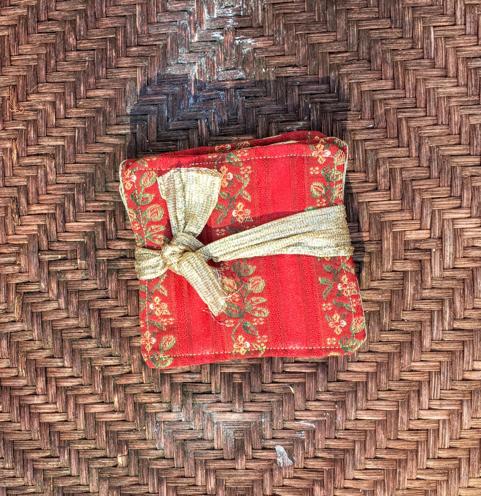 Fancy holiday colors. Lined with a thin layer of batting to help absorb moisture. This a pack of 4 for $15.